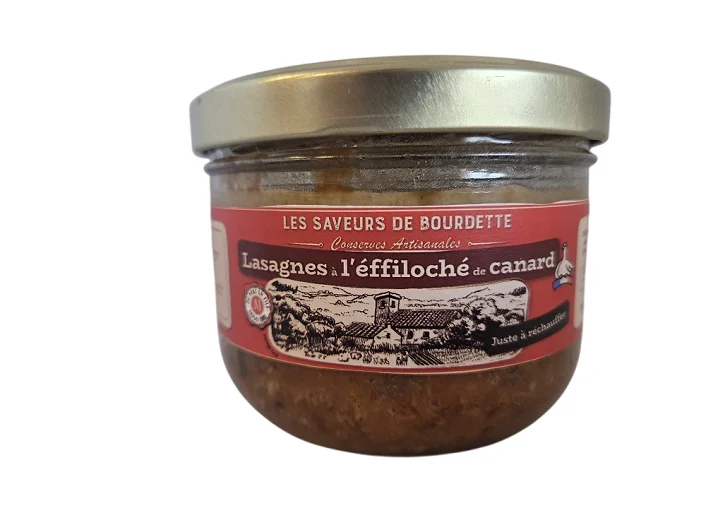 Lasagnes gourmandes à l’effiloché de canard, sauce tomate cuisinée et préparation onctueuse au lait et beurre. Une recette raffinée, prête à réchauffer.