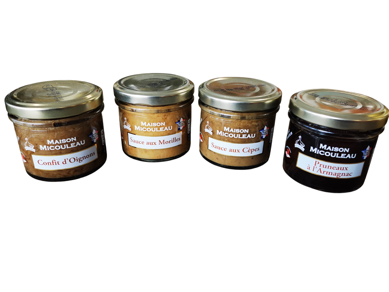 Lot de 4 bocaux 100g – Sauce aux cèpes, Sauce aux morilles, Confit d’Oignons, Pruneaux à l'armagnac.