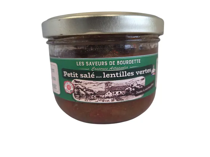 Petit salé aux lentilles cuisiné avec porc et lentilles origine France, saucisse de Toulouse et légumes mijotés. Un grand classique du terroir, prêt à réchauffer.